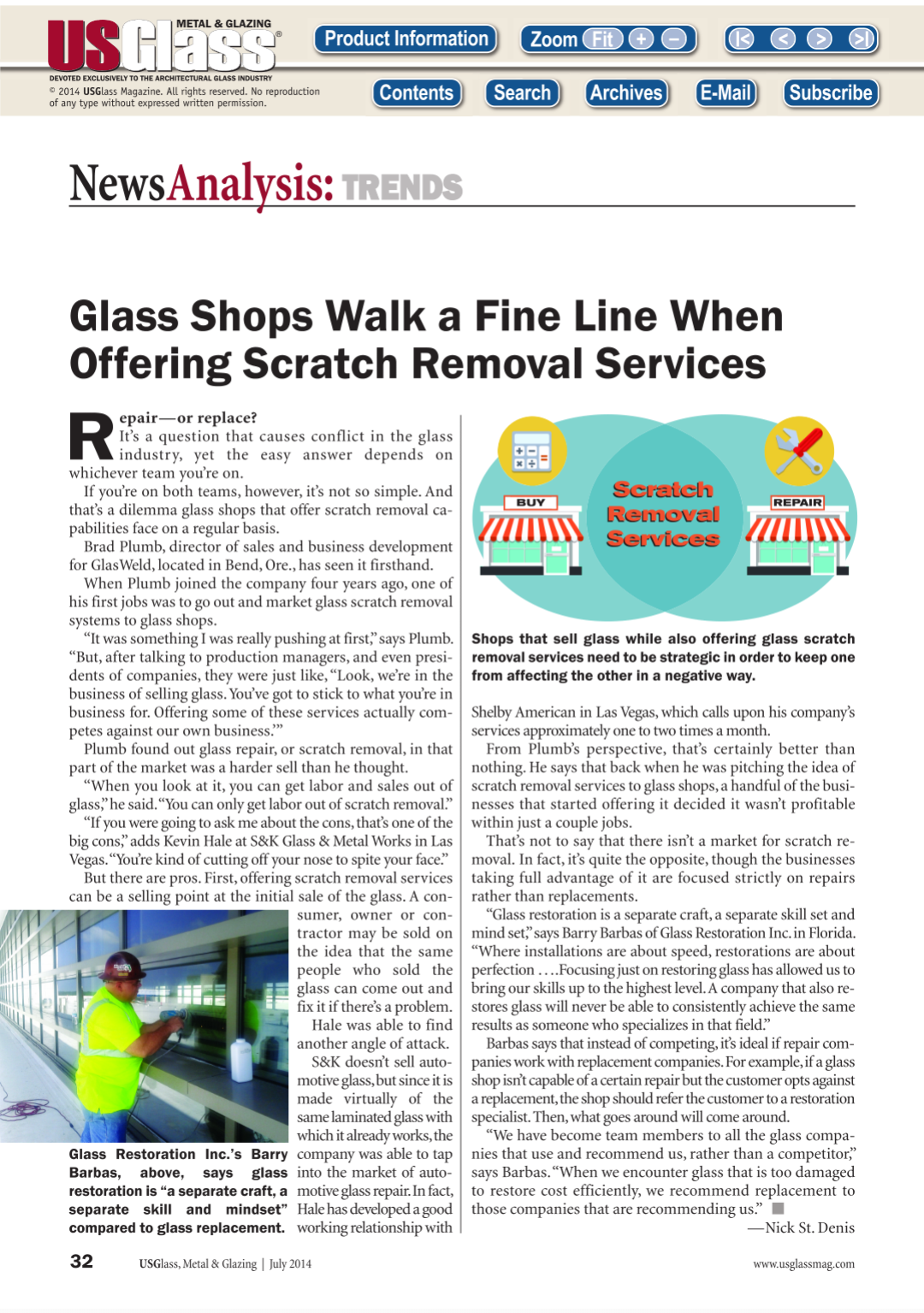 Glass Restoration Inc. is proud to be a recurring voice in the industry’s most prestigious publications. We have been featured in USGlass Magazine for our specialized architectural restoration work, highlighting our ability to save high-value commercial glass in complex environments like hospitals and stadiums.