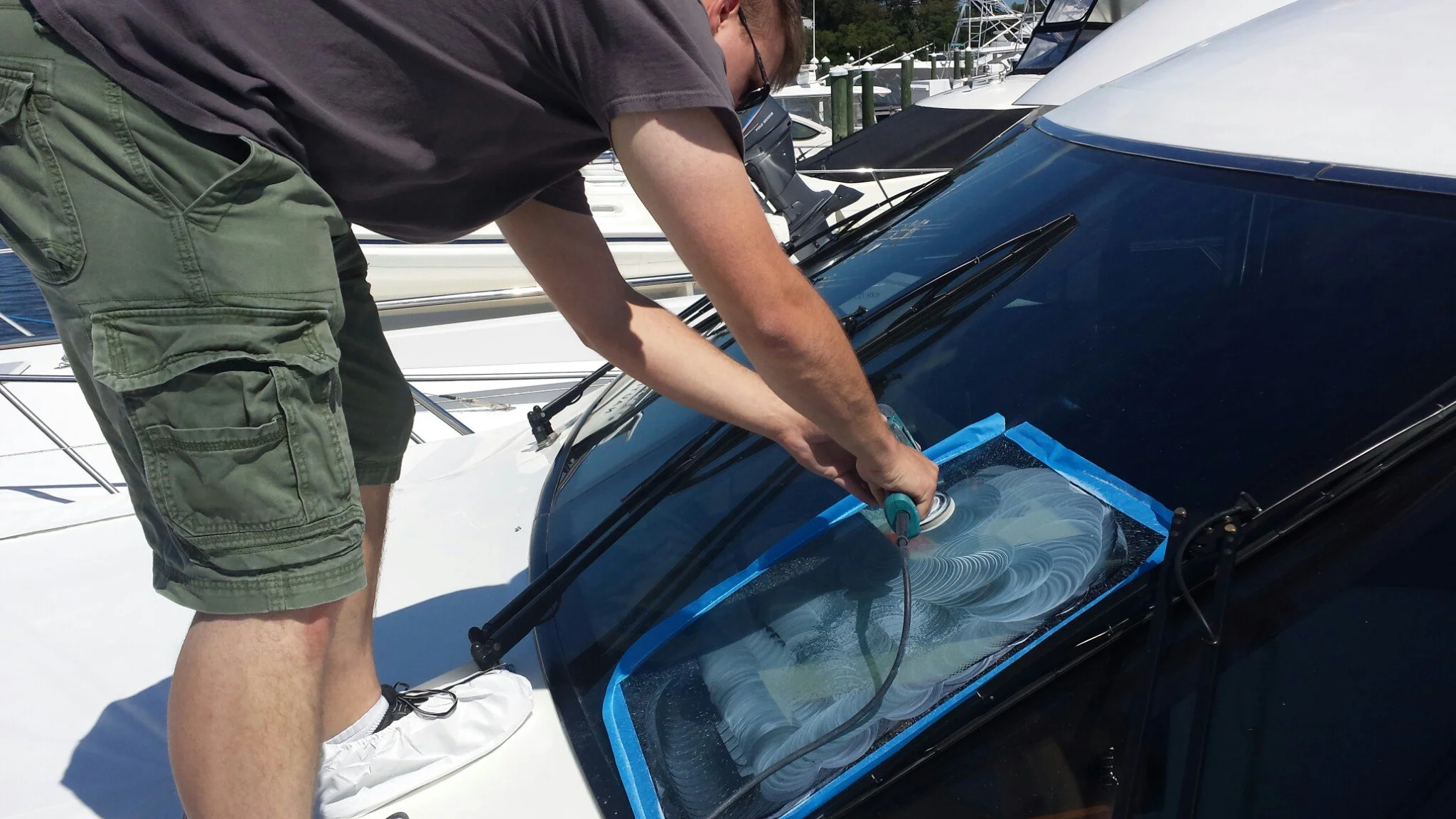Person polishing a wet boat windshield with a power tool, water droplets visible on the glass, red life jackets inside boat cabin.
