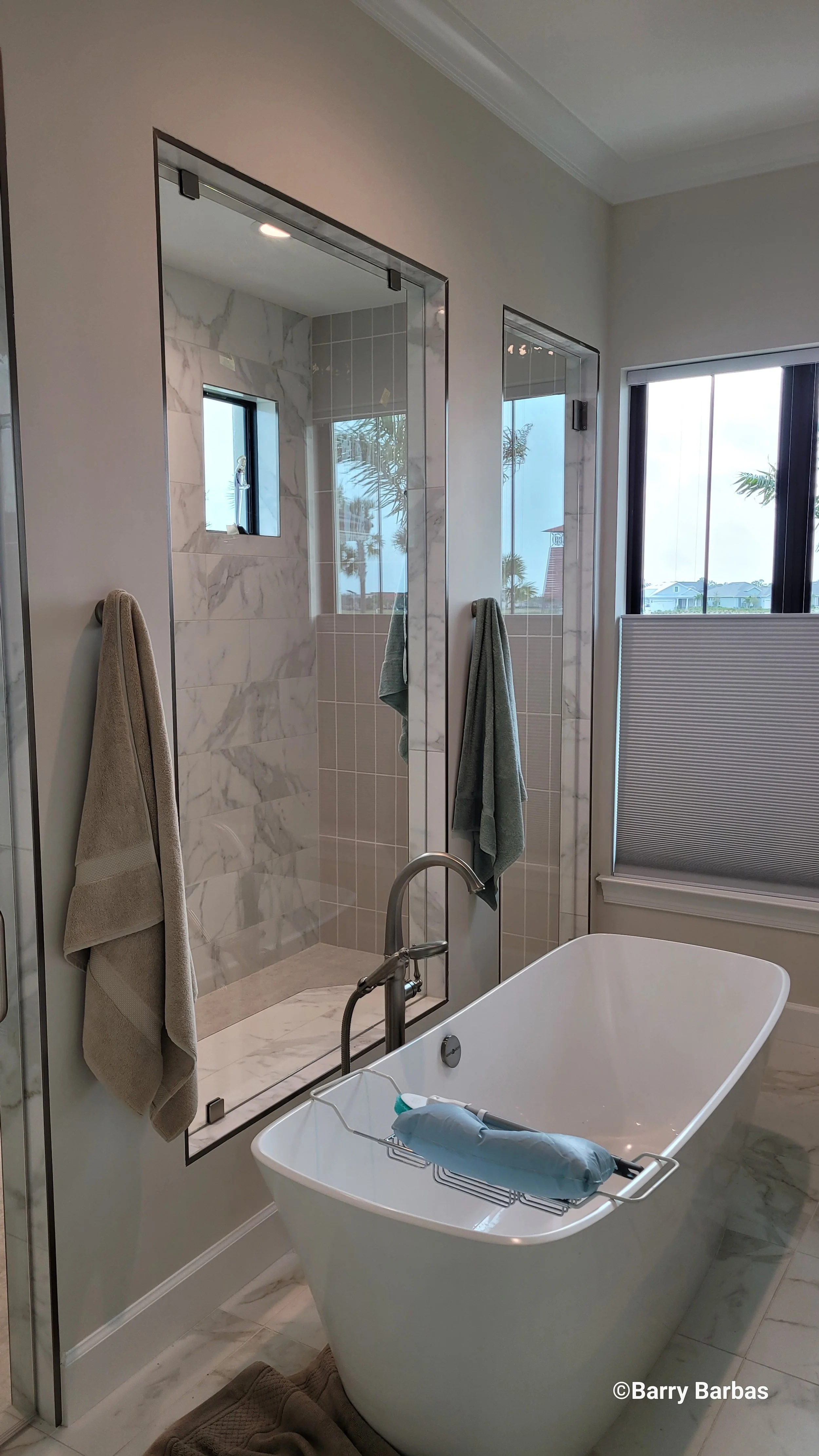Modern bathroom with freestanding white bathtub, marble tiles, glass shower enclosure, and towels on racks.