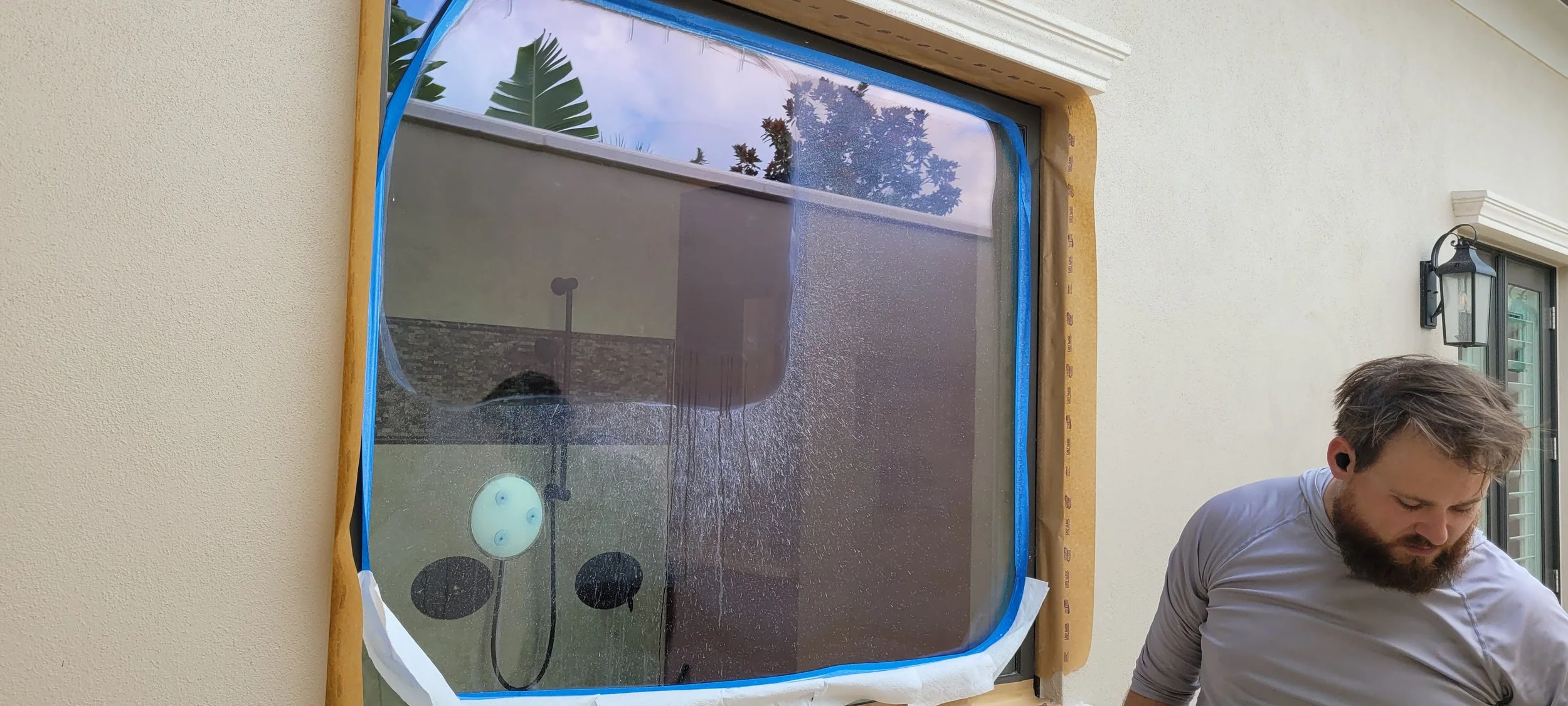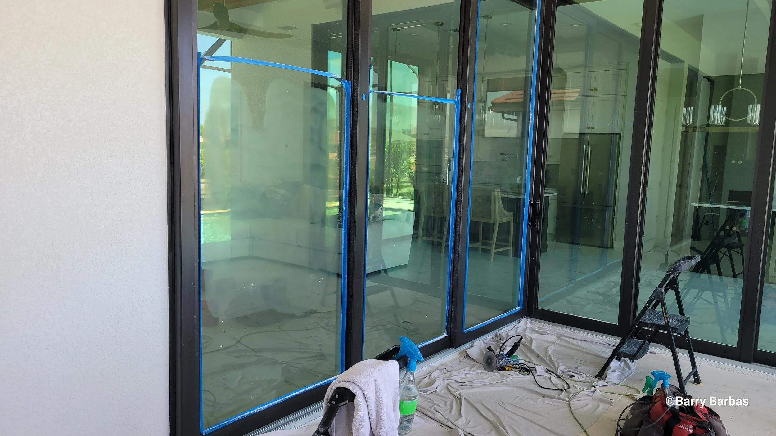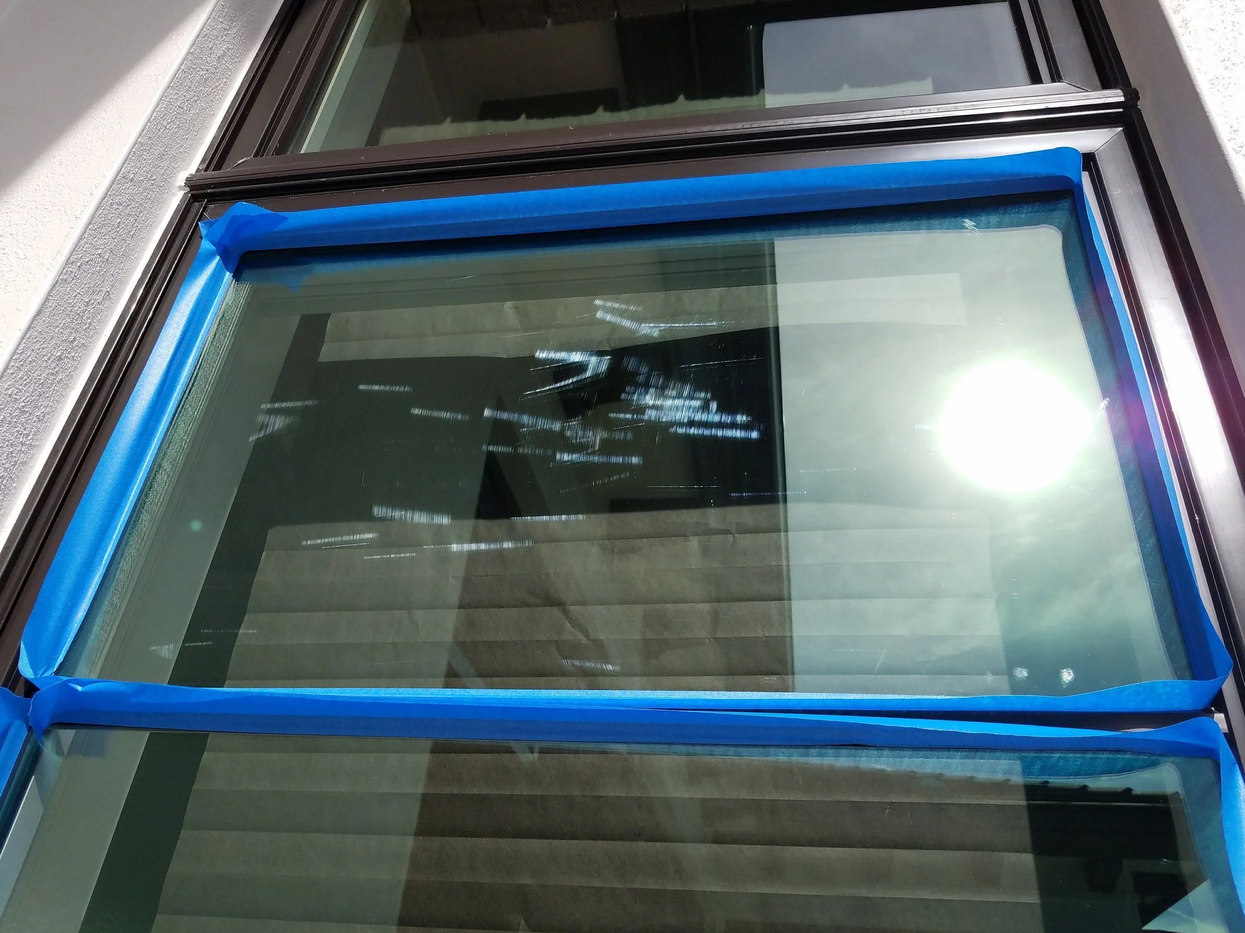 A person polishing scratches on large windows using a tool and blue tape in a residential setting.