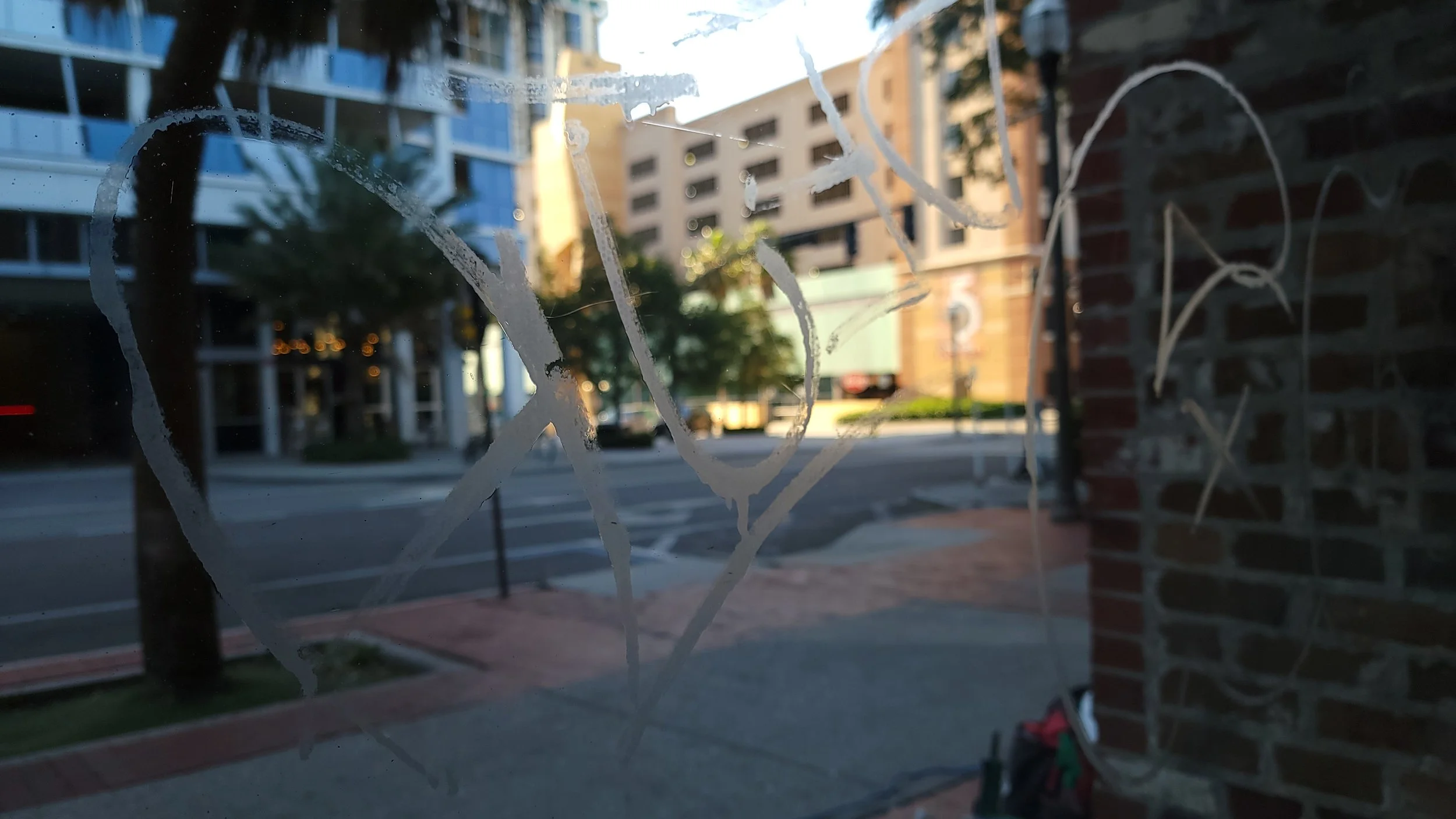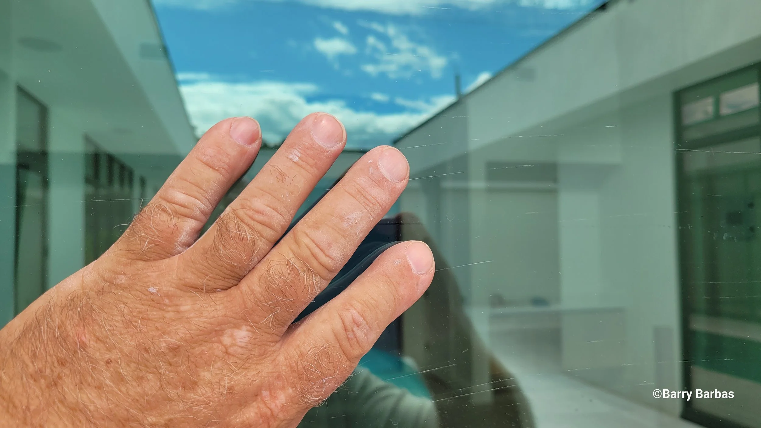 A close-up of a finger pointing at scratches on a glass surface with a blurred interior backdrop.