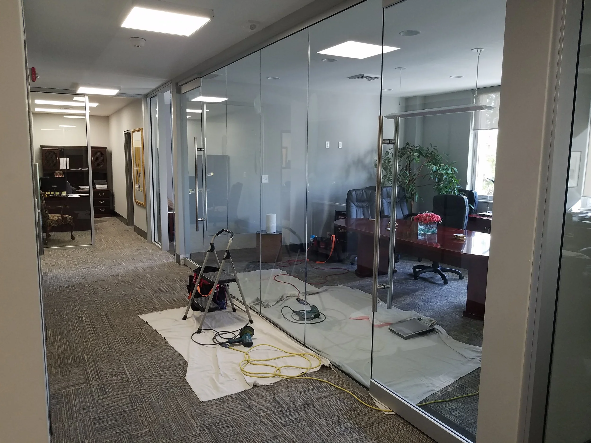 Office hallway with glass-walled conference room, featuring a table with chairs, a step ladder, and cleaning equipment on the floor.