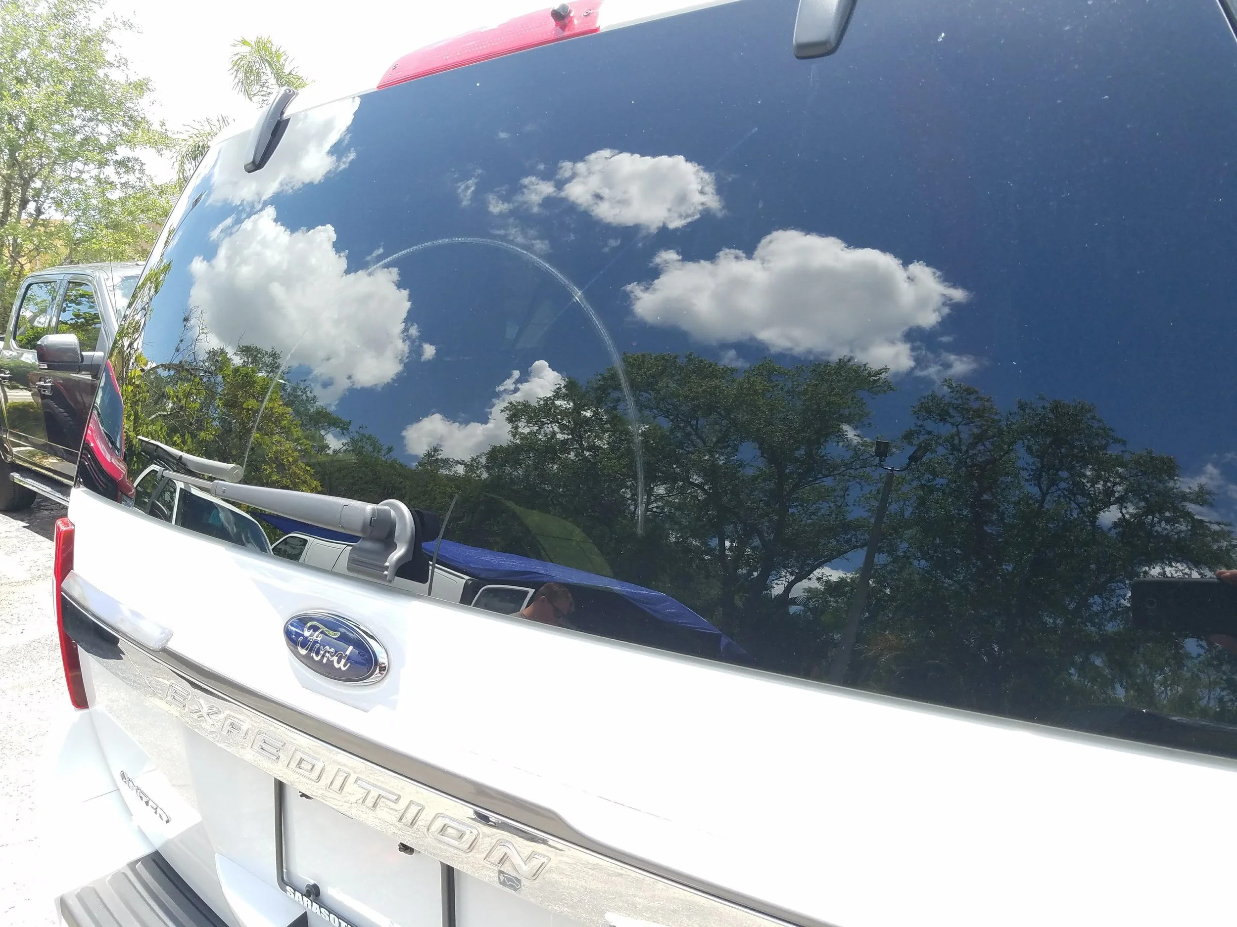 Reflection of clouds and trees on the rear window of a white Ford Expedition.