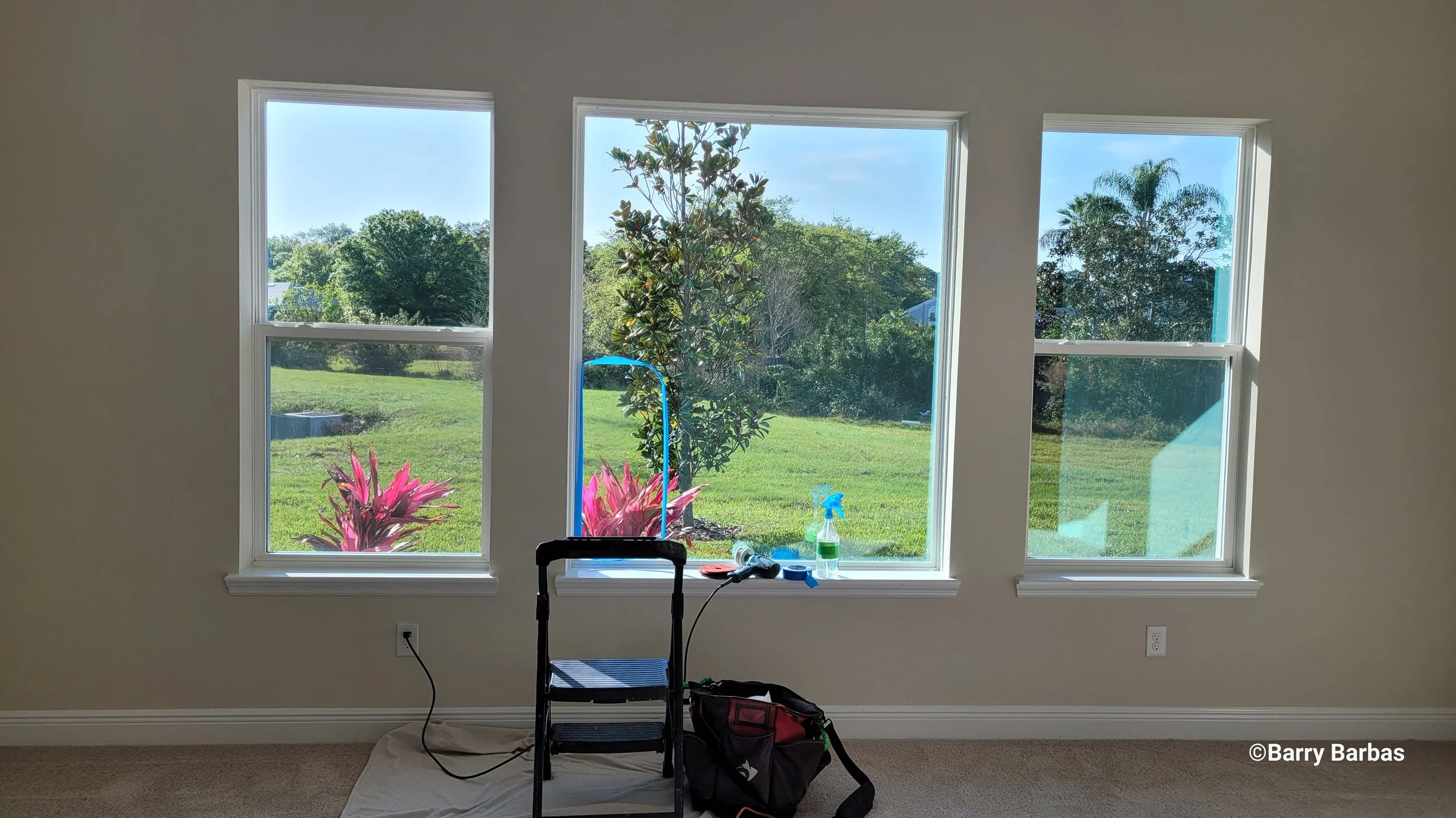 Interior view of three large windows showing a grassy outdoor area with trees. Inside, a step ladder is placed on a white sheet, with a tool bag and cleaning supplies nearby.