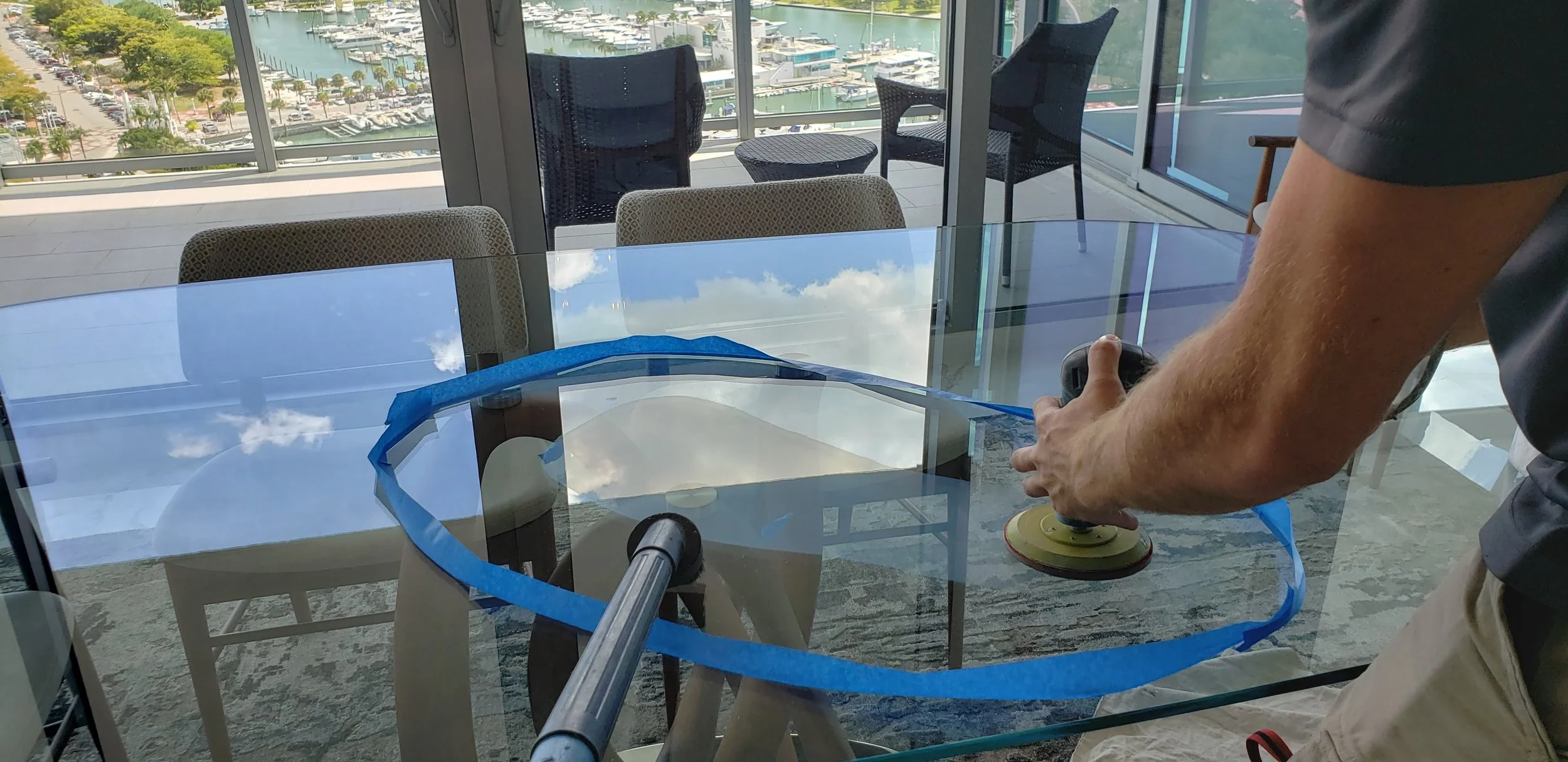 Person using electric sander on glass table with blue tape, overlooking marina view.