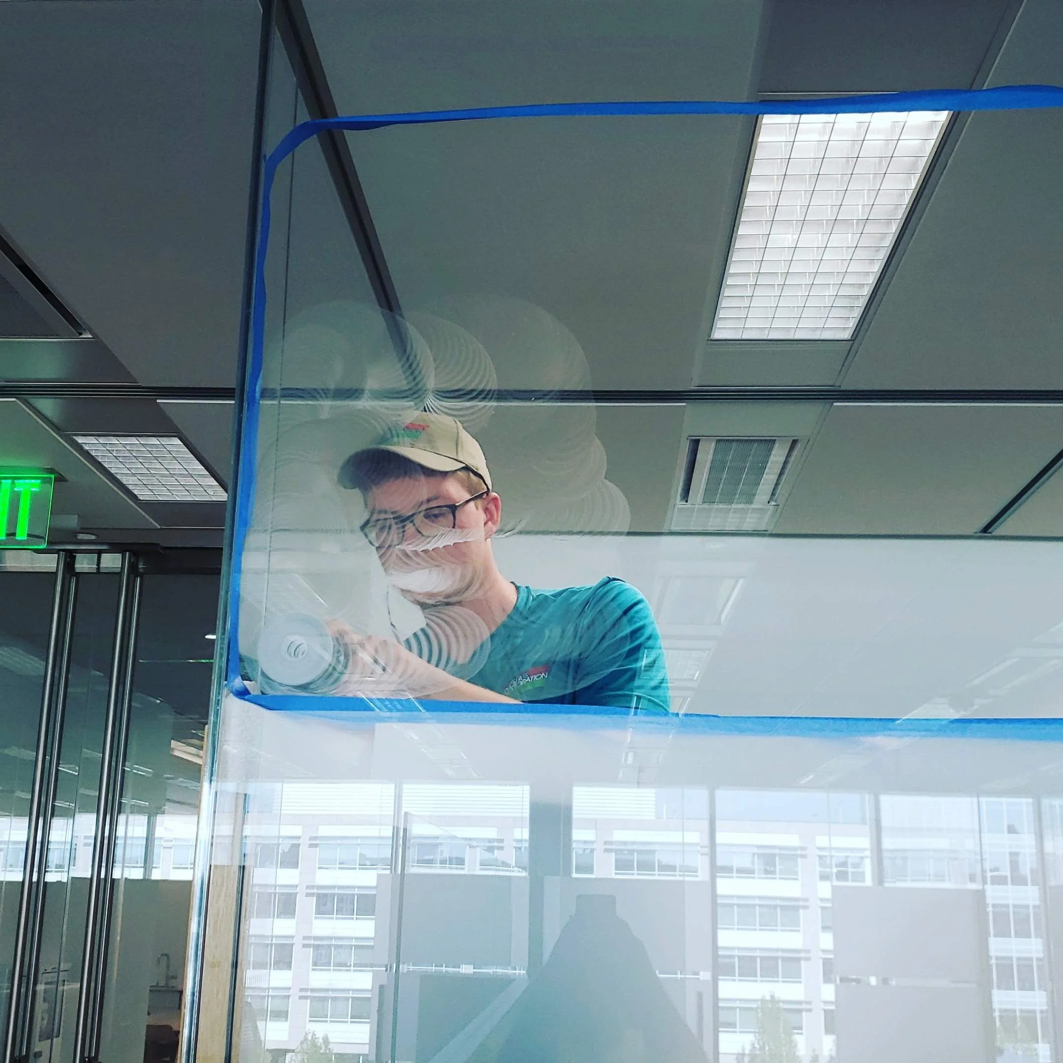 Person wearing a mask and yellow shirt standing on a ladder, working on a glass window with tools, in an outdoor urban setting with buildings and greenery in the background.