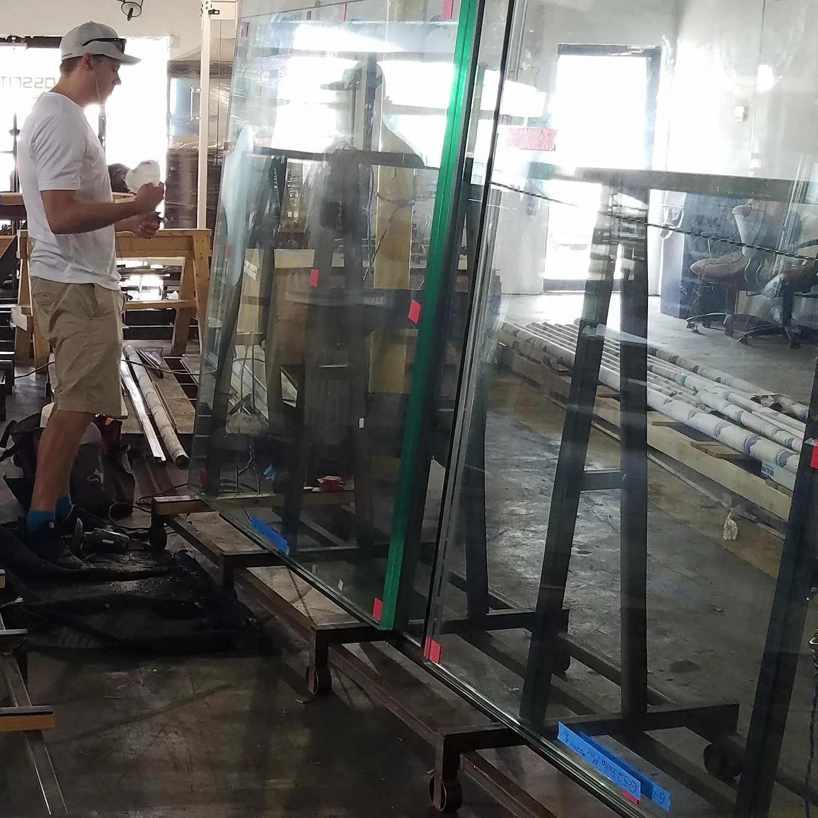 Person wearing a cap and mask polishing large glass panels, surrounded by frames and packaging in a workshop or warehouse setting.